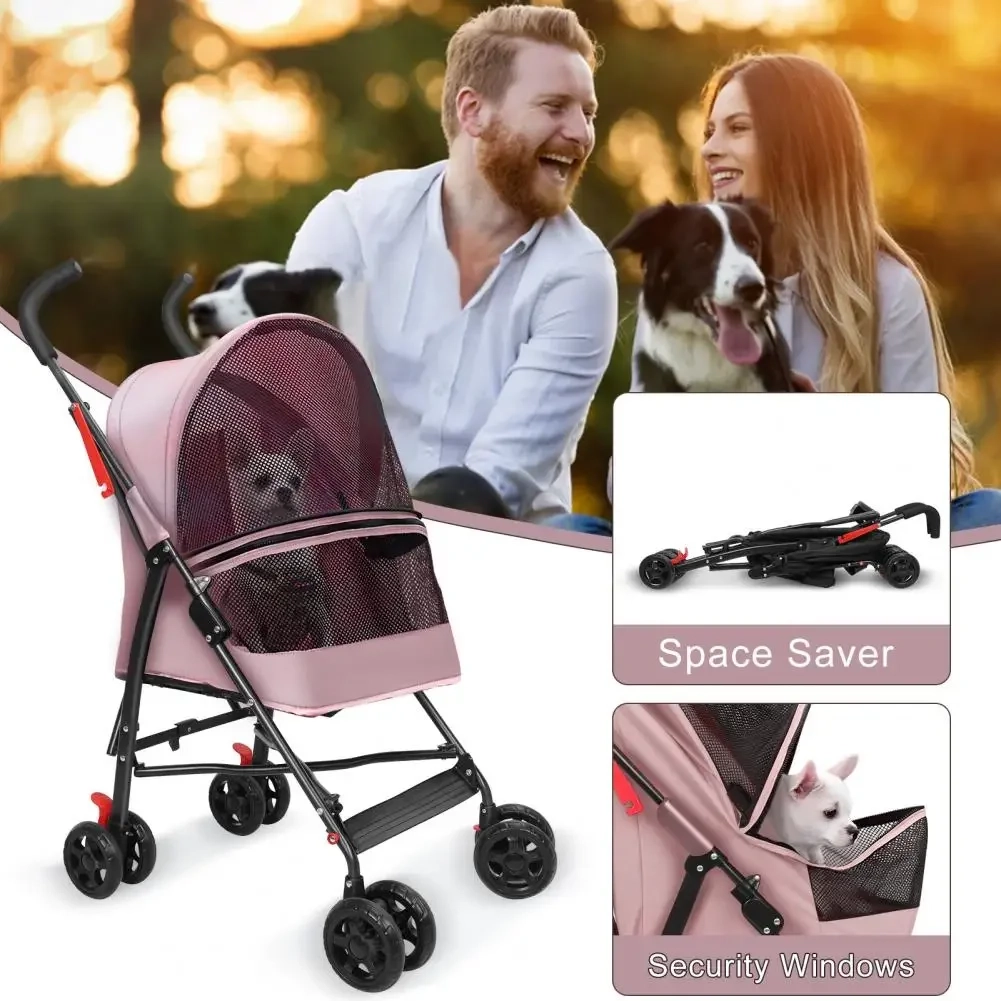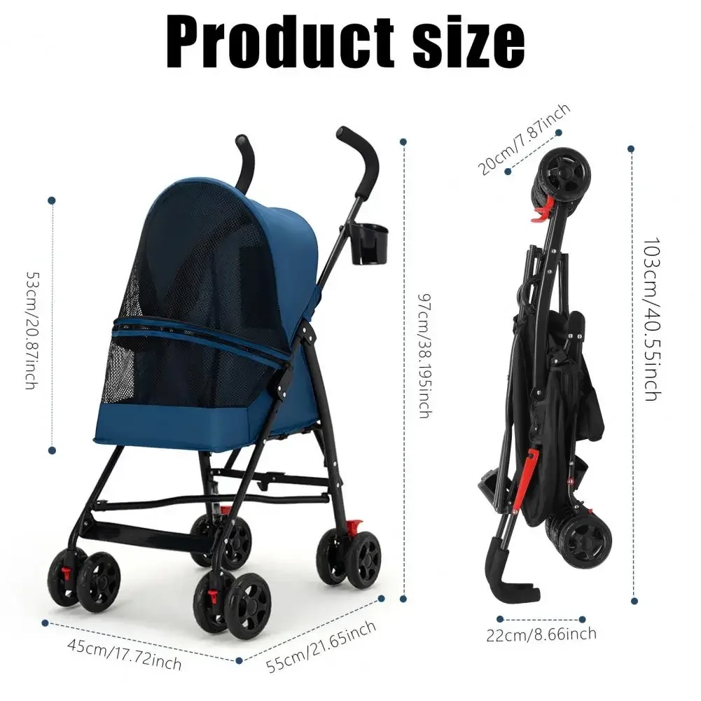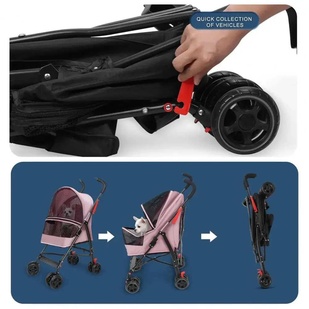 Make outdoor walks and daily outings easier with this 4-wheel pet jogging stroller designed for smoother movement, breathable comfort, and everyday convenience. The ventilated mesh enclosure helps create a more open and airy riding space, while the sunshade design adds extra coverage during outdoor use. Its suspension-style wheel setup helps reduce bumps along the way, and the enclosed cabin gives pets a more secure place to ride during walks, errands, and short trips. With practical storage details and multiple color options, it is a useful everyday stroller for small pets that prefer a more comfortable and supported ride.