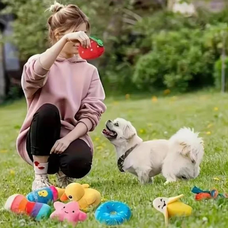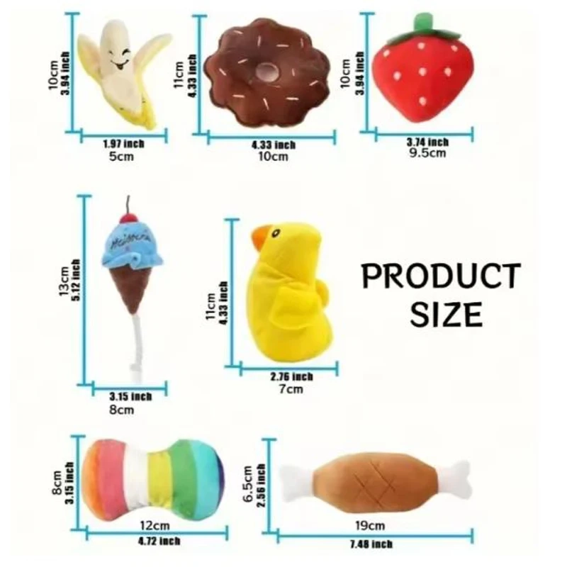 Make everyday playtime more exciting with this 7-piece plush dog toy set designed for chewing, carrying, and interactive fun. Featuring playful fruit, snack, and vegetable-inspired shapes, this set adds extra variety to your dog’s toy collection while keeping daily play fresh and engaging. The soft plush texture gives each toy a comfortable feel, and the sound feature helps capture your pet’s attention during indoor play sessions. It is a fun multi-piece set for puppies and dogs that enjoy tossing, biting, and exploring different shapes throughout the day.