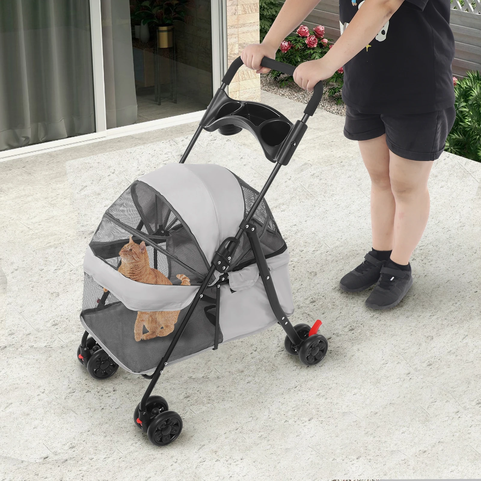 Enjoy smoother outings with this foldable pet stroller designed for everyday walks, shopping trips, and short-distance travel. The spacious basket-style cabin gives pets a more comfortable place to rest while staying close to you, and the breathable mesh panels help support better airflow during use. Front swivel wheels make it easier to navigate around corners and tighter spaces, while the rear brake design helps add control when you need to stop and secure the stroller. With its foldable frame and lightweight structure, it is a practical option for small to medium pets on the go.