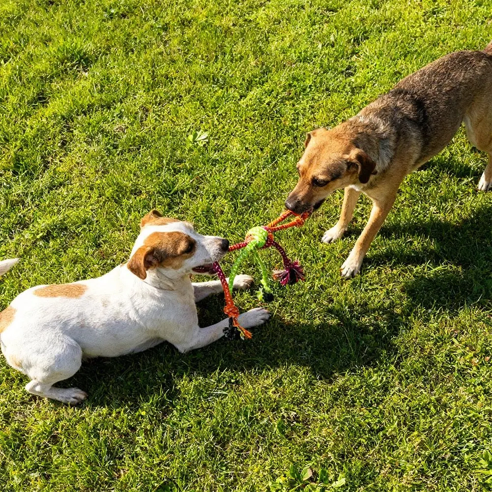 Keep your dog busy and engaged with this knotted rope toy designed for chewing, tossing, and interactive play. The woven rope construction gives dogs a satisfying texture to bite and carry, while the knotted shape makes it easy to grab during everyday play sessions. Fringe details add extra movement and visual interest, making it a fun option for dogs that enjoy staying active indoors or during bonding time with their owners. It is a simple everyday toy for chewing, light tugging, and self-play.