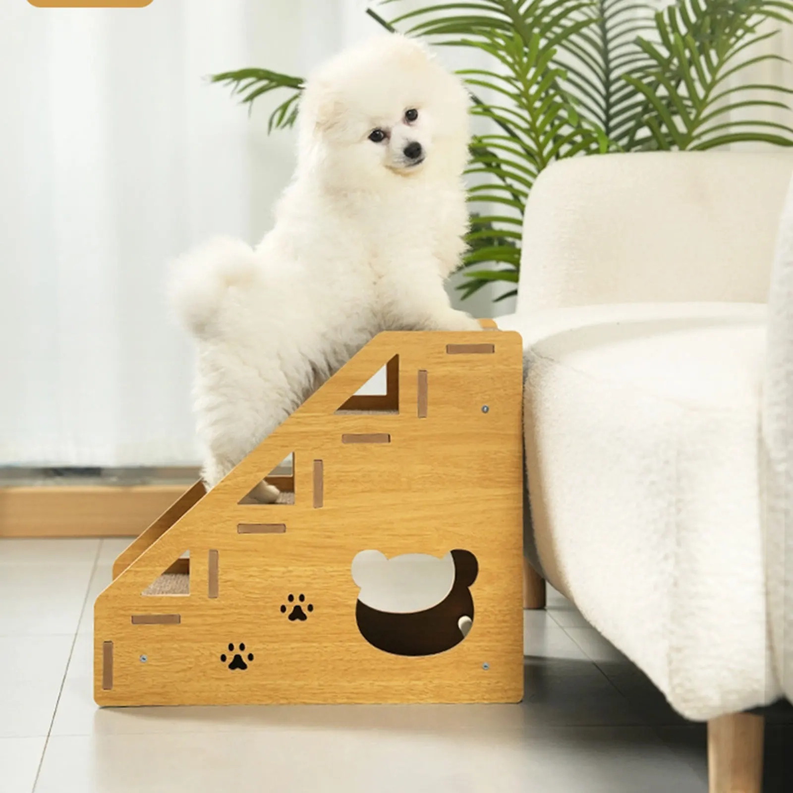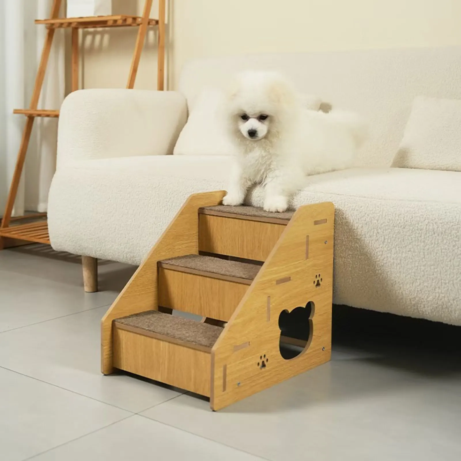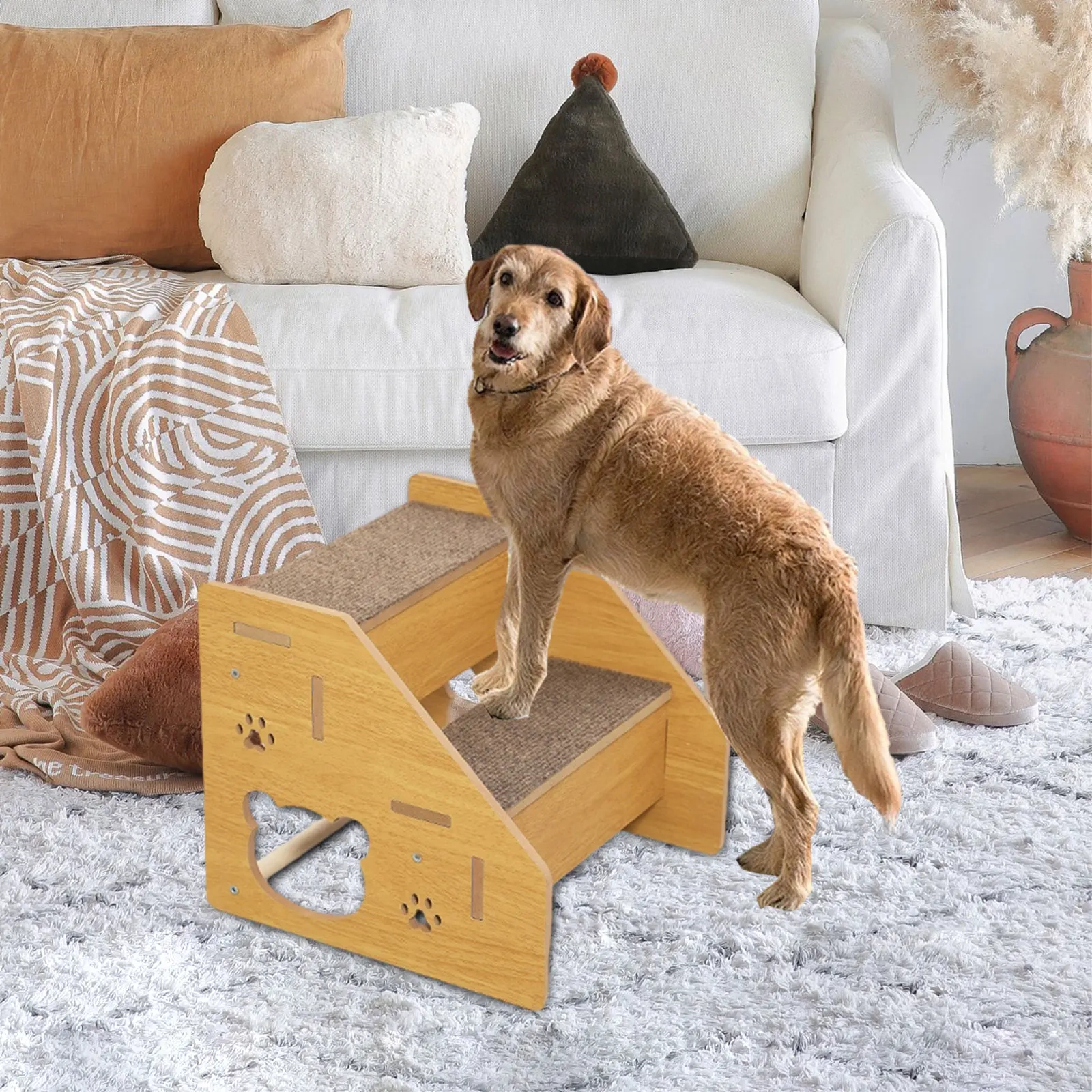 Help pets reach beds, sofas, cars, and other elevated spots more easily with these non-slip wooden pet steps designed for everyday use. The sturdy wooden structure creates a reliable climbing path, while the textured carpet-style surface helps pets move up and down with better grip and confidence during daily routines. Available in multiple step options and size variations, this design makes it easier to match different furniture heights and access needs around the home. With a simple practical look and supportive build, it offers a convenient way to improve everyday pet mobility.