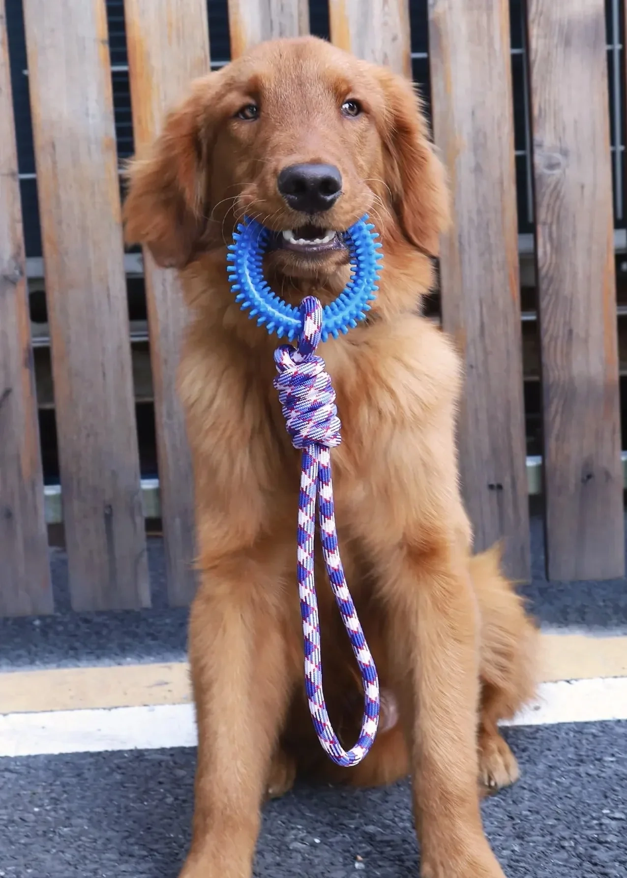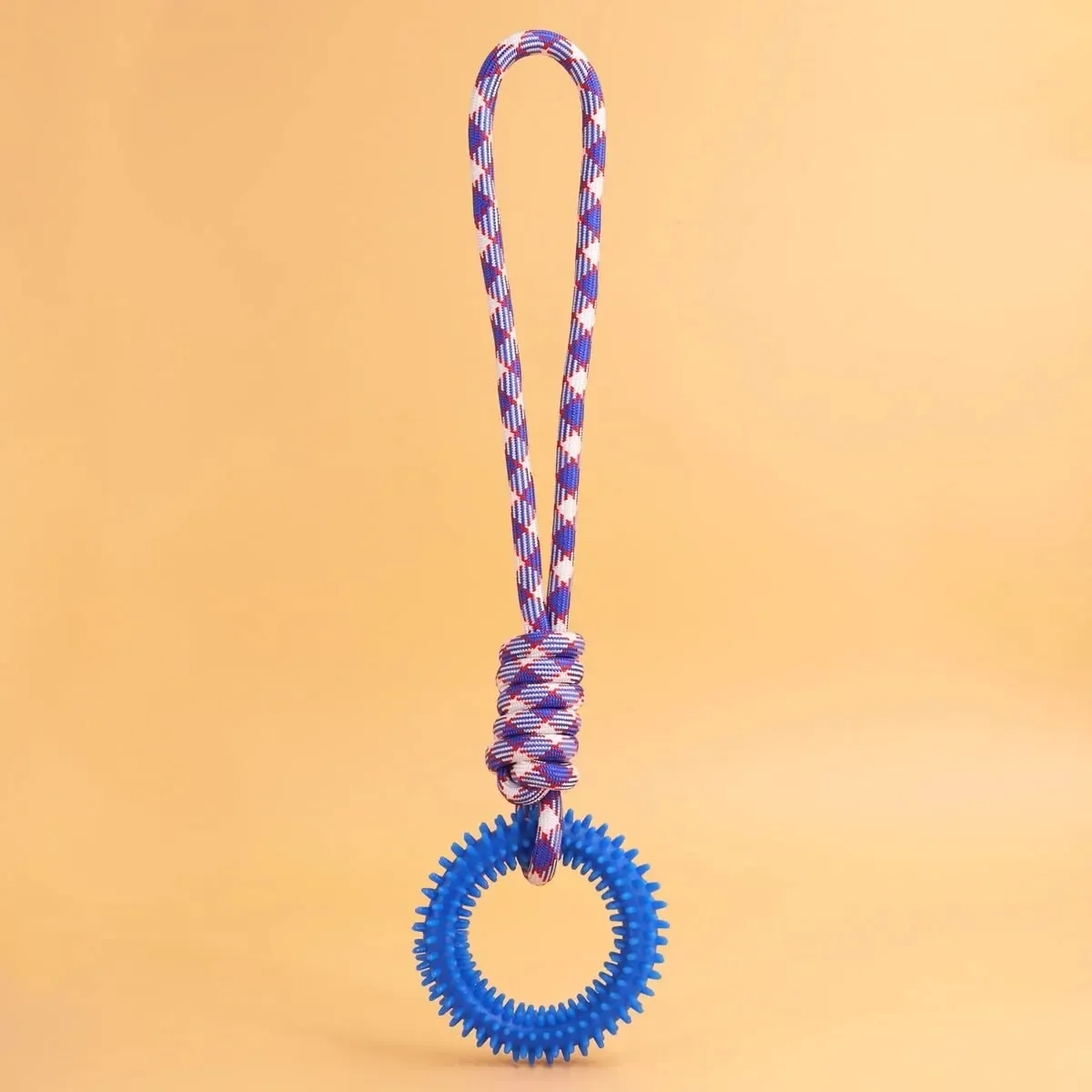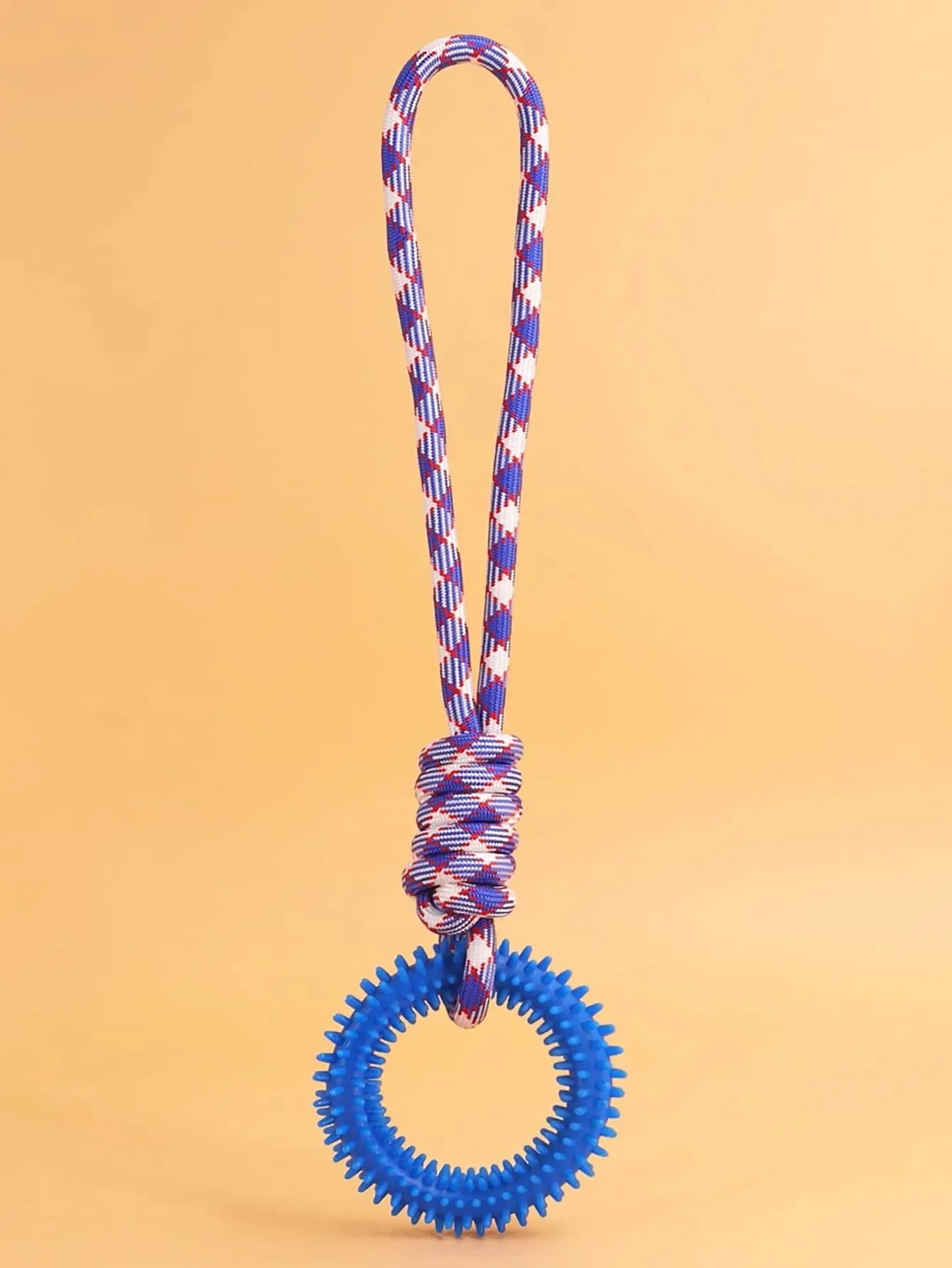 Keep your dog active and entertained with this rope and rubber ring chew toy designed for chewing, tugging, and everyday interactive play. The combination of woven rope and textured rubber adds variety to playtime, giving dogs different ways to bite, carry, and stay engaged. Its easy-to-hold shape makes it suitable for solo play as well as bonding time with you, while the durable design works well for both indoor and outdoor fun. Available in multiple color options, it is a playful everyday choice for dogs that enjoy active chewing and interactive movement.