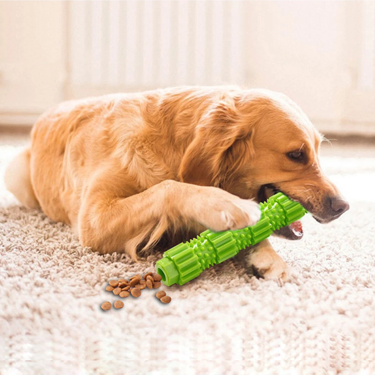 Keep your dog engaged with this rubber chew toy designed for chewing, treat-filled play, and everyday activity. The long shape is easy for dogs to grab and carry, while the treat-dispensing design adds extra interest during playtime and helps turn simple chewing into a more rewarding routine. Made for interactive fun and independent play, it is a practical option for dogs that enjoy staying occupied, working for treats, and exploring different textures during daily play sessions.